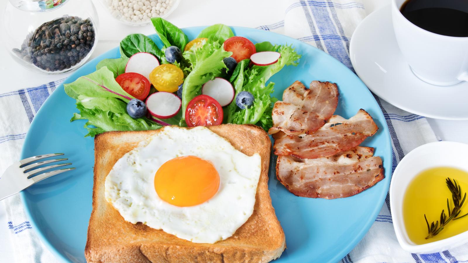 Wallpaper Scrambled eggs with bread on a plate with salad and bacon