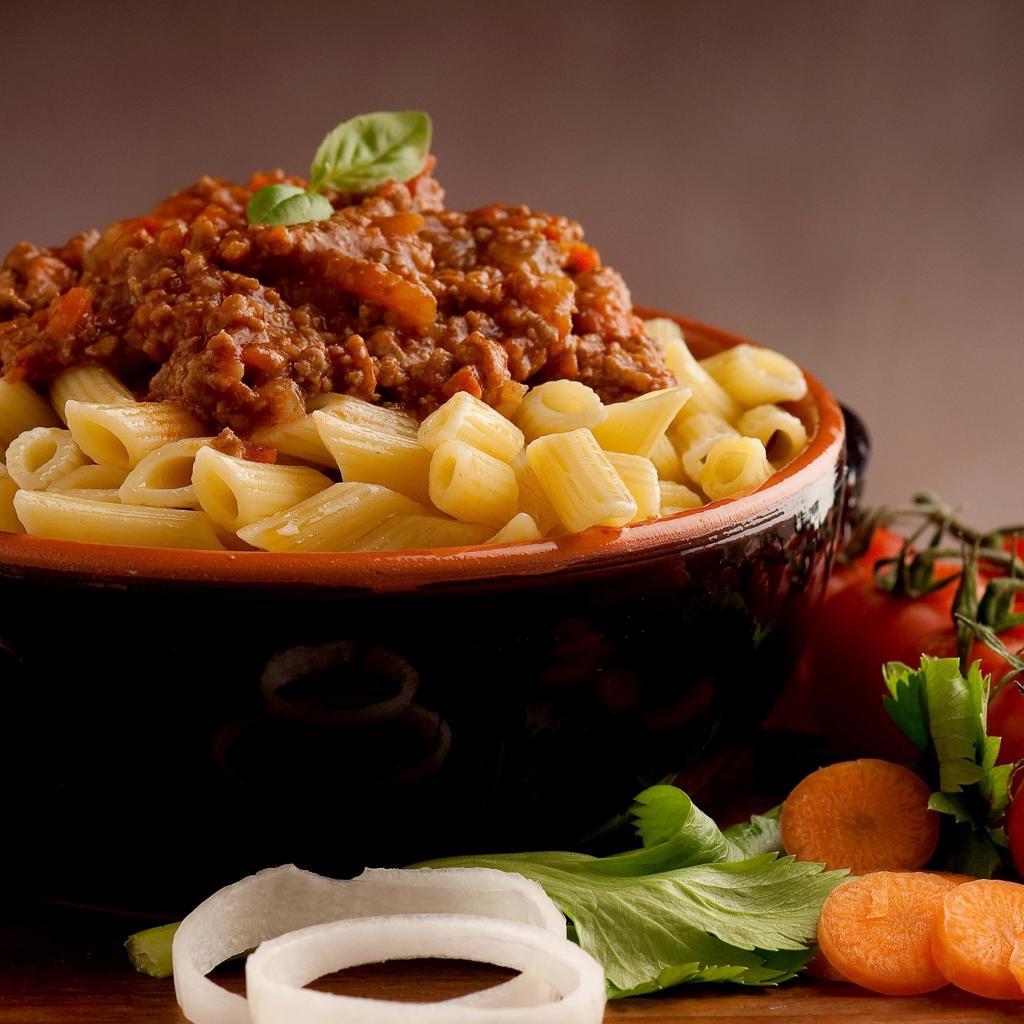 Wallpaper Pasta in a bowl with minced meat on a table with tomatoes