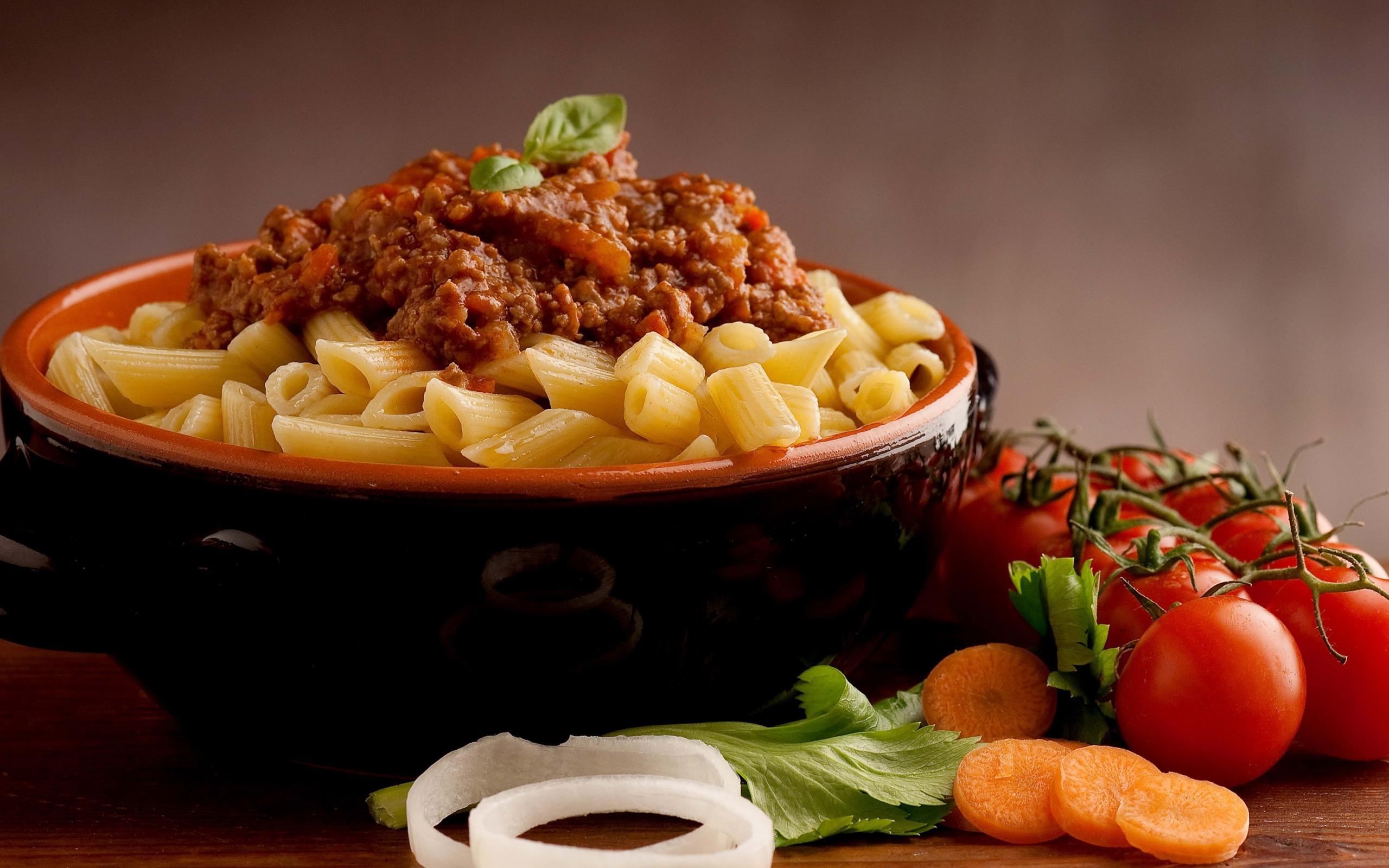 Wallpaper Pasta in a bowl with minced meat on a table with tomatoes