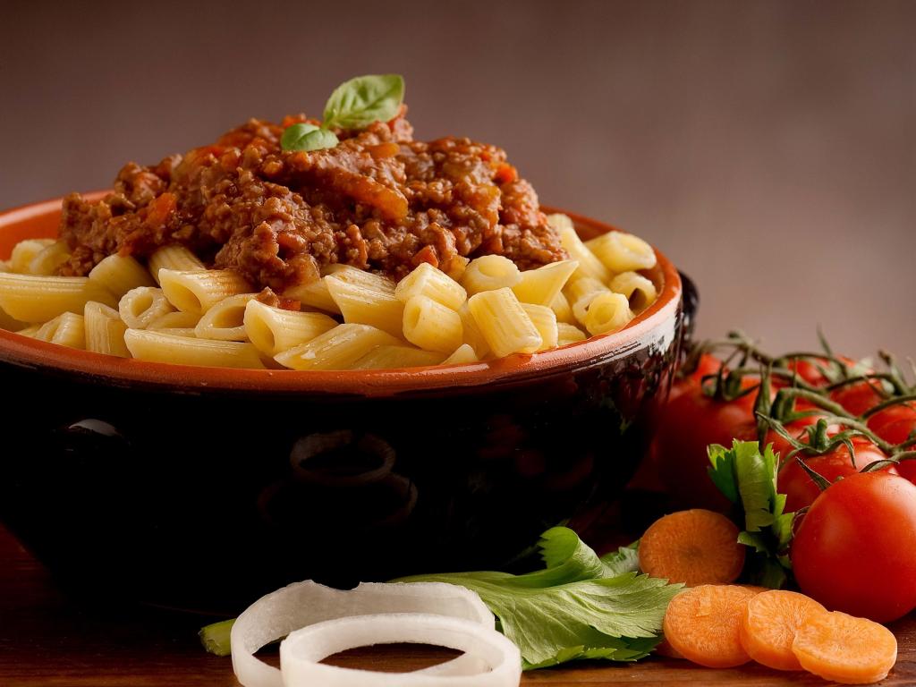 Wallpaper Pasta in a bowl with minced meat on a table with tomatoes