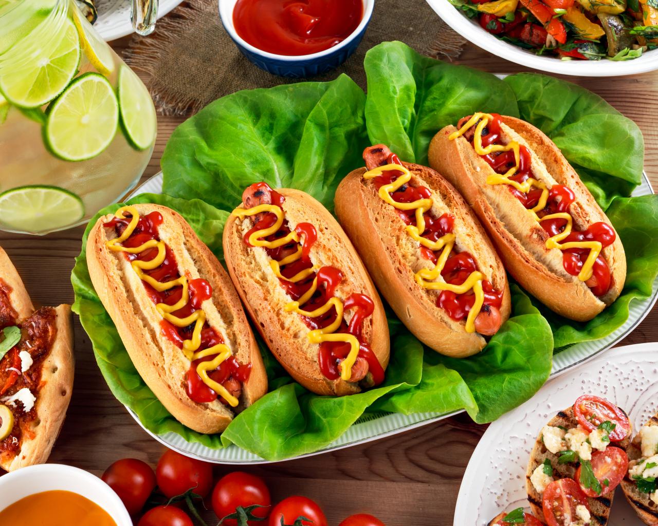 Wallpaper Hotdogs, pizza, lemonade and salad on the table