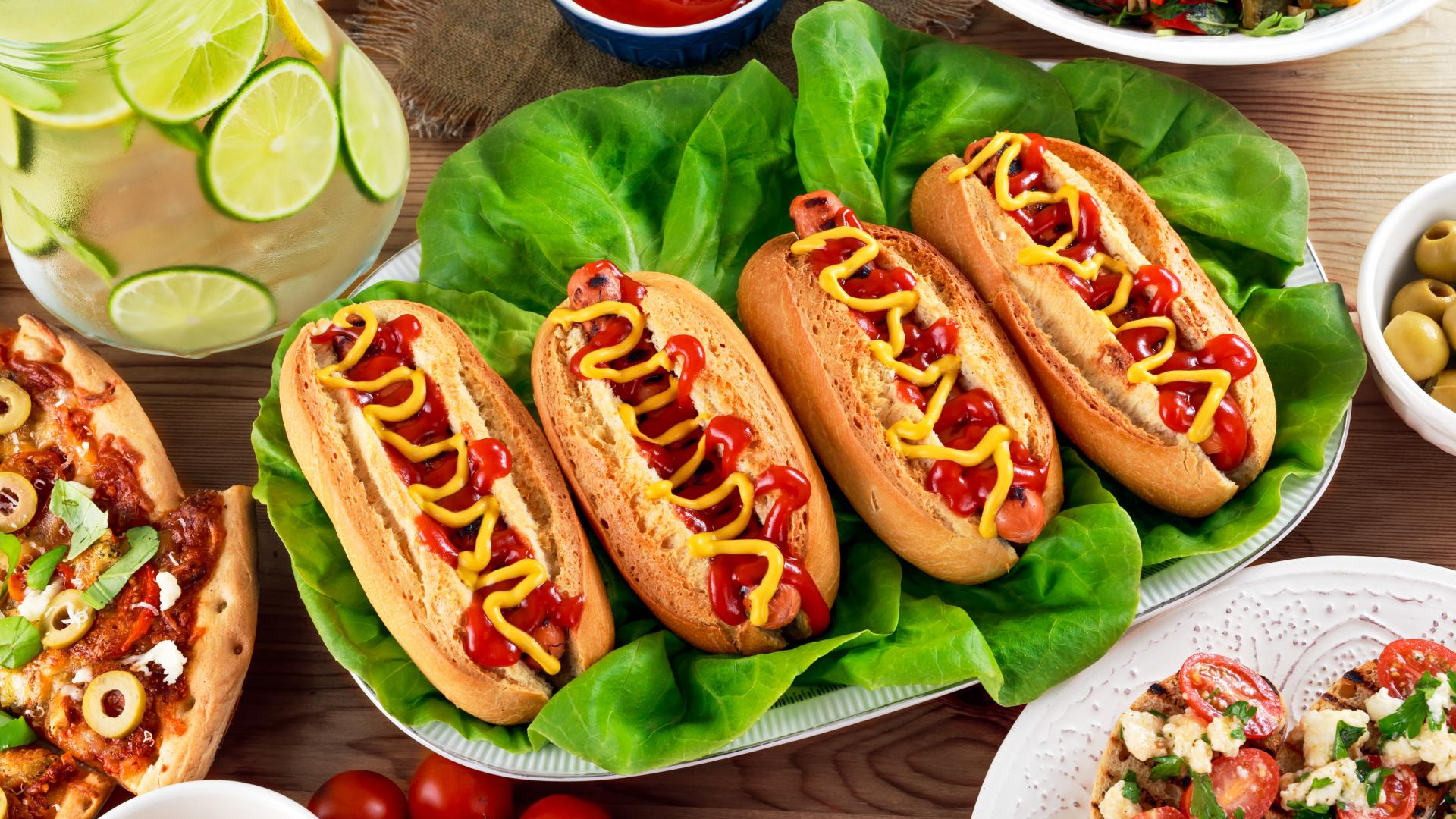 Wallpaper Hotdogs, pizza, lemonade and salad on the table