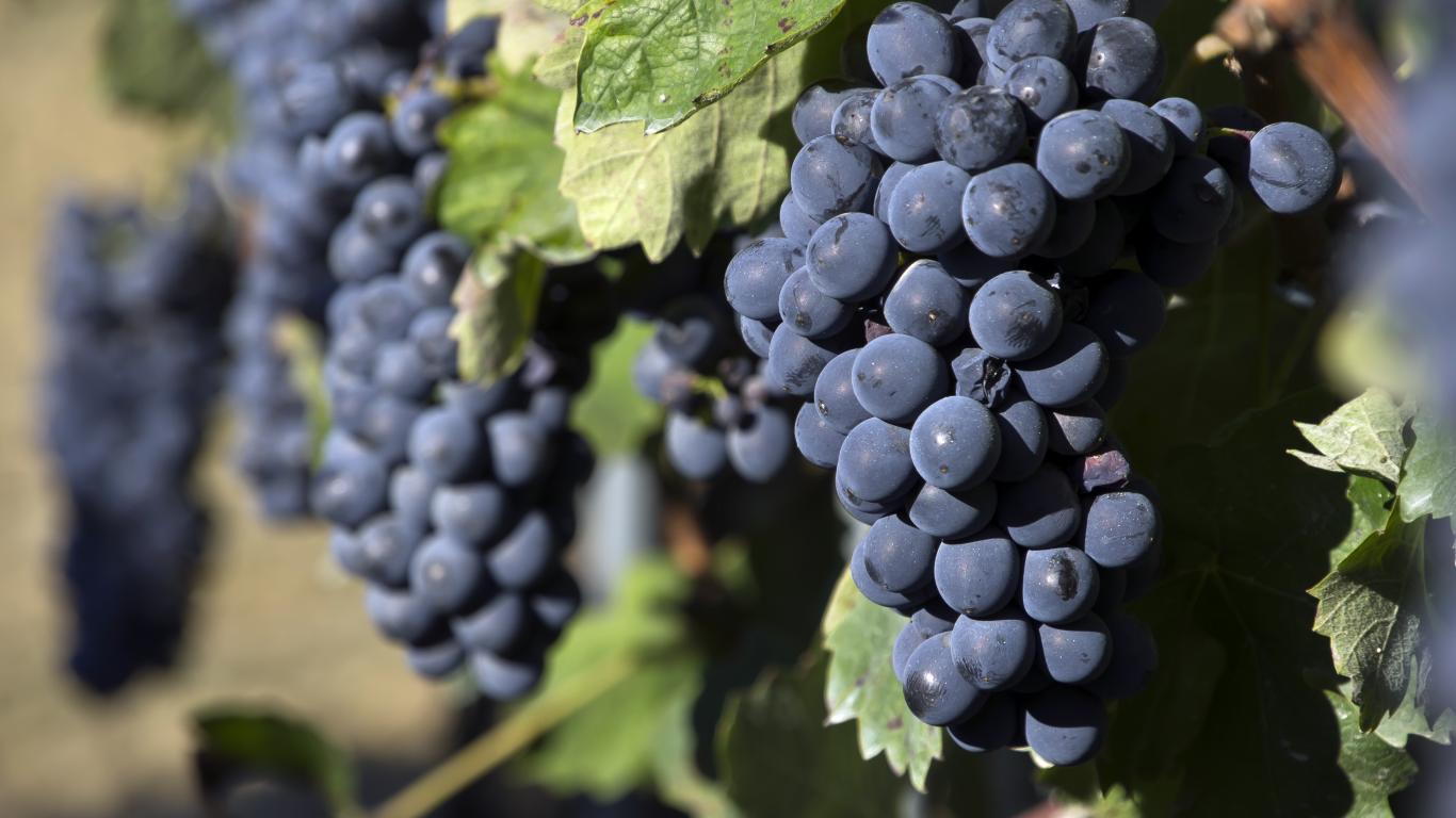 Wallpaper Vineyards with ripe blue grapes under the blue sky in autumn