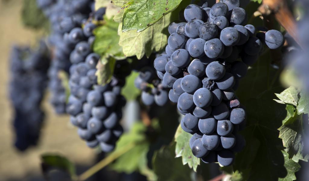 Wallpaper Vineyards with ripe blue grapes under the blue sky in autumn