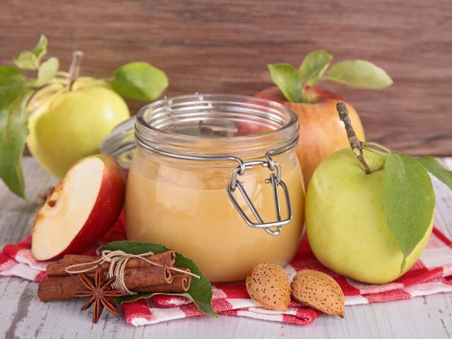 Wallpaper Bank of apple jam with spices on the table