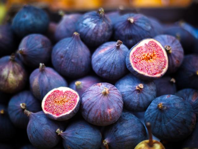 Wallpaper Fresh pieces of figs and apples in a plate on a table