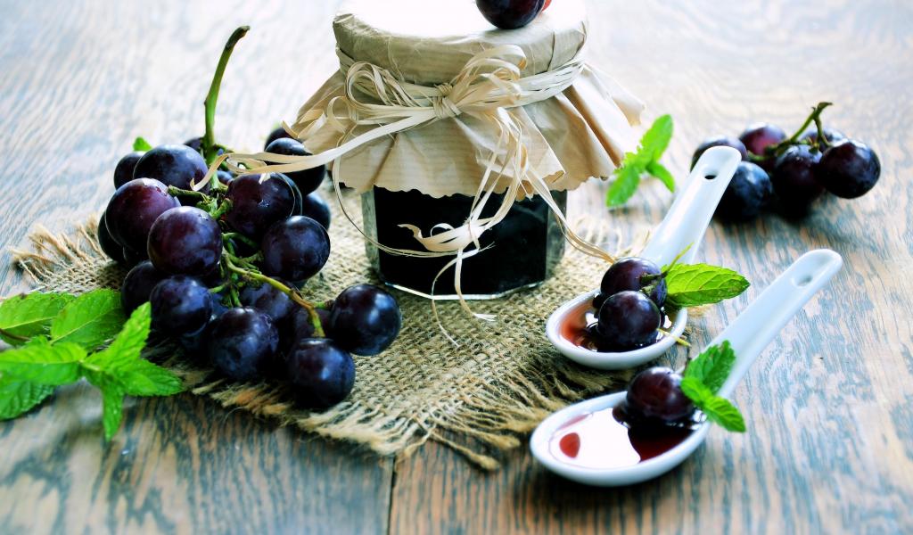 Wallpaper Grapes of blue and white grapes with wine glasses on a wooden barrel