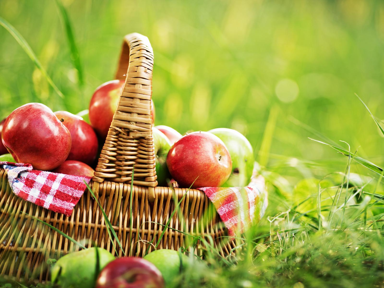 Wallpaper Basket of red apples stands on green grass