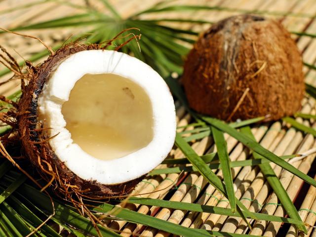 Wallpaper Broken coconut lies on green palm leaves