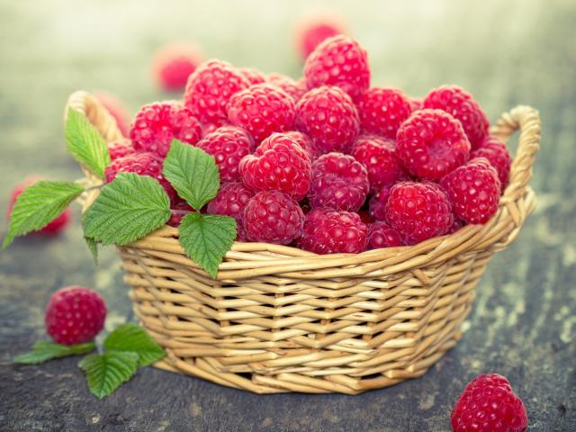 Wallpaper Large ripe raspberries in a wooden bowl on a table