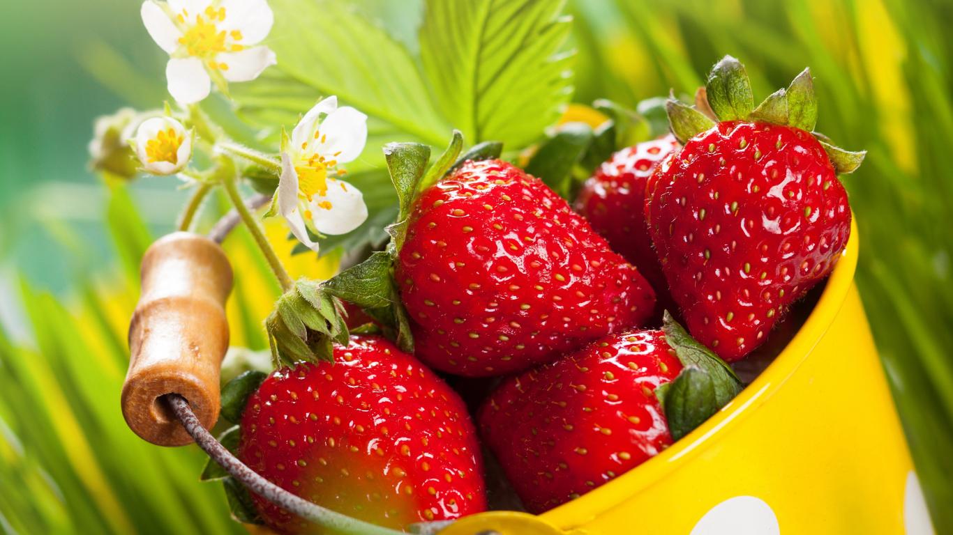 Wallpaper Fresh strawberry with yogurt for breakfast on a table with a white flower