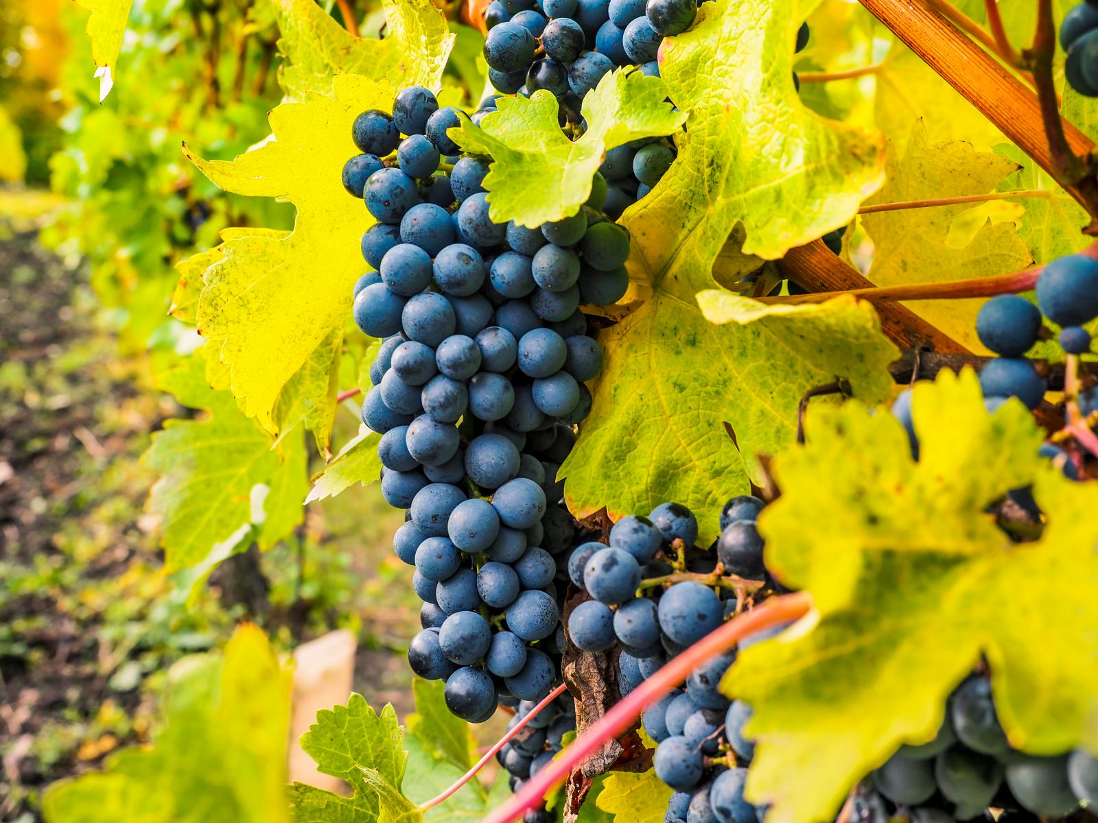 Wallpaper Vineyards with ripe blue grapes under the blue sky in autumn