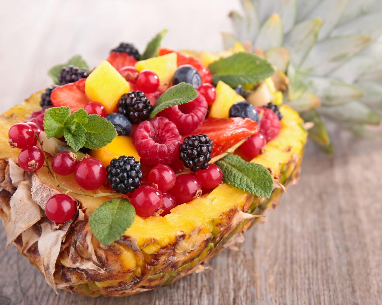 Wallpaper Fruit salad of citrus fruits in a plate of fresh pineapple