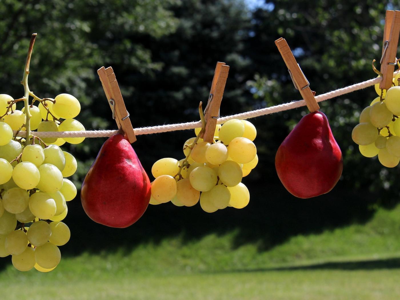Wallpaper White grapes and red pears on a rope