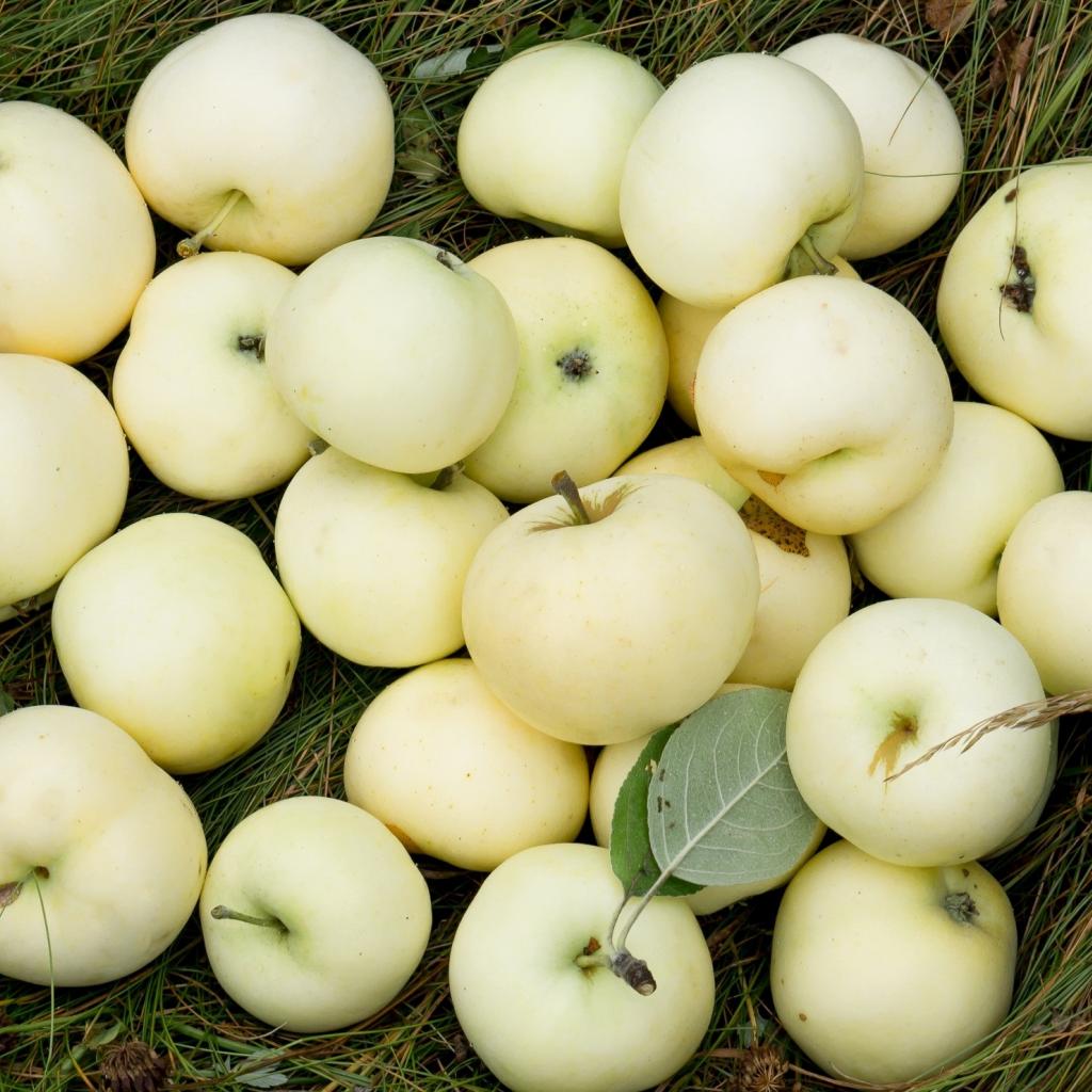 Wallpaper White pouring apples are on the grass