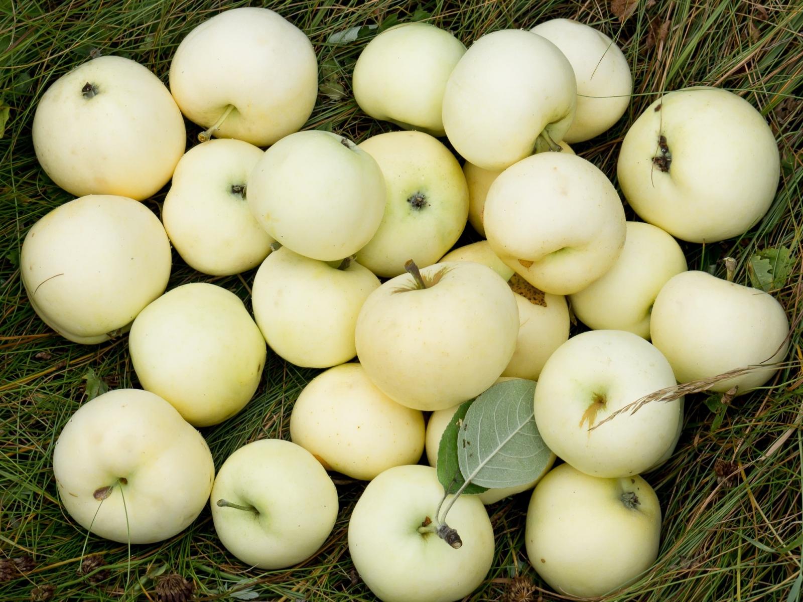 Wallpaper White pouring apples are on the grass