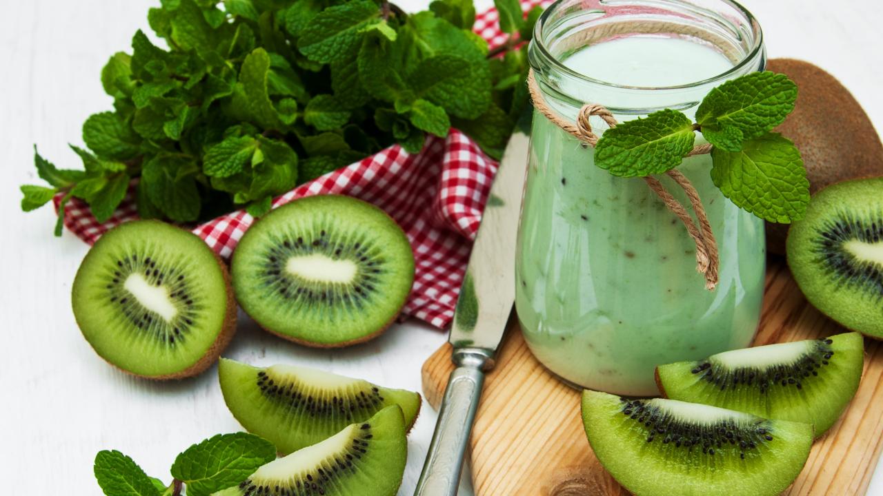 Wallpaper Two green smoothies on a table with kiwi, mint and a green apple