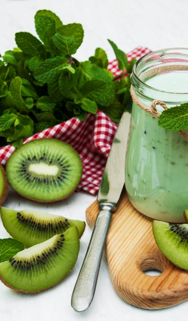 Wallpaper Glass of green smoothies on a table with kiwi, cucumber and broccoli