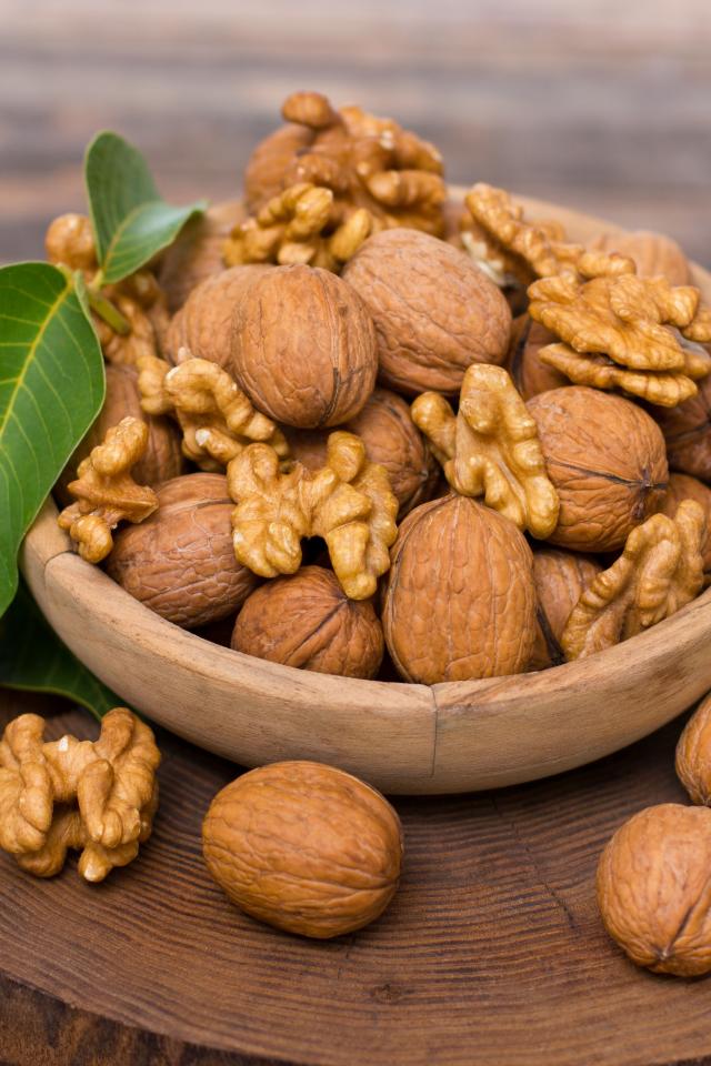 Wallpaper Walnuts in a bowl on a wooden board