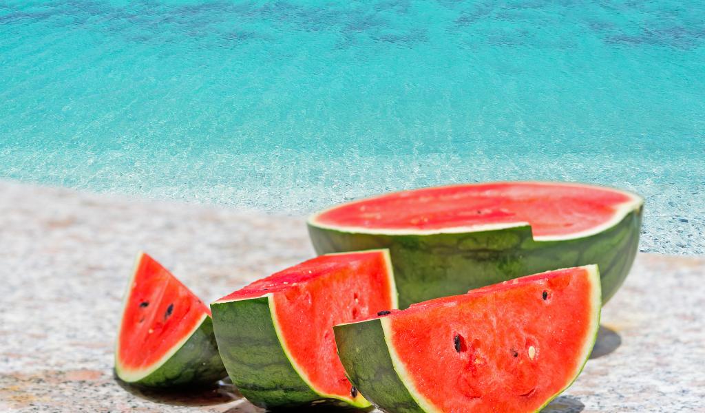 Wallpaper Appetizing red watermelon near the water