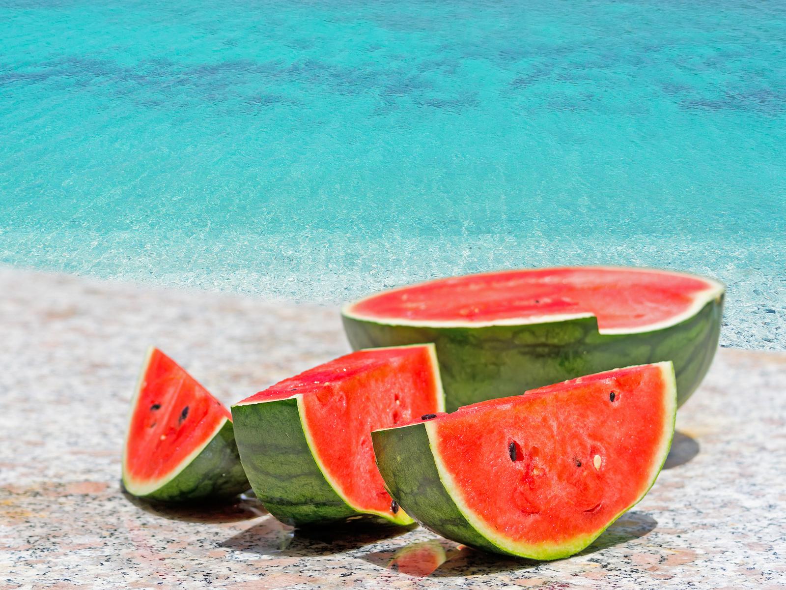 Wallpaper Appetizing red watermelon near the water