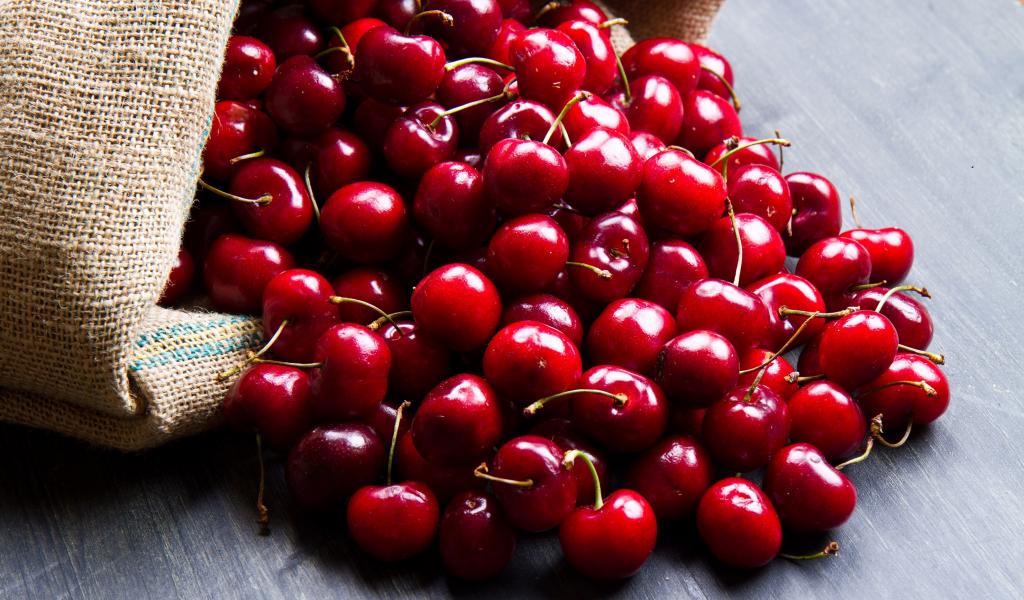 Wallpaper Ripe red cherries in a bag on the table