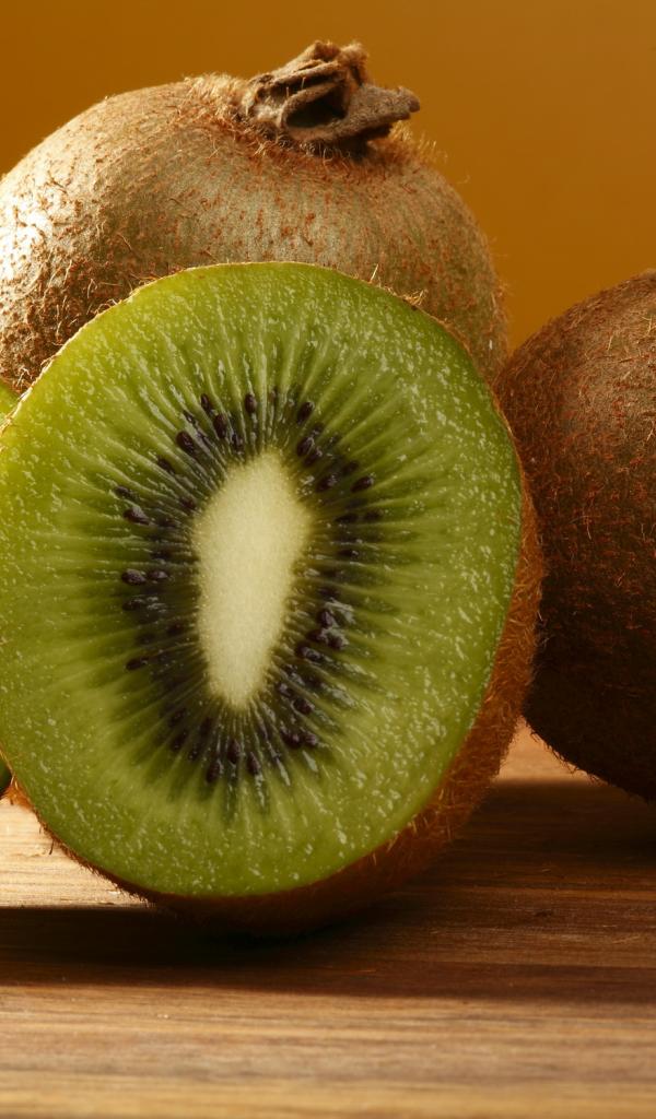 Wallpaper Juicy green kiwi on a wooden table close-up