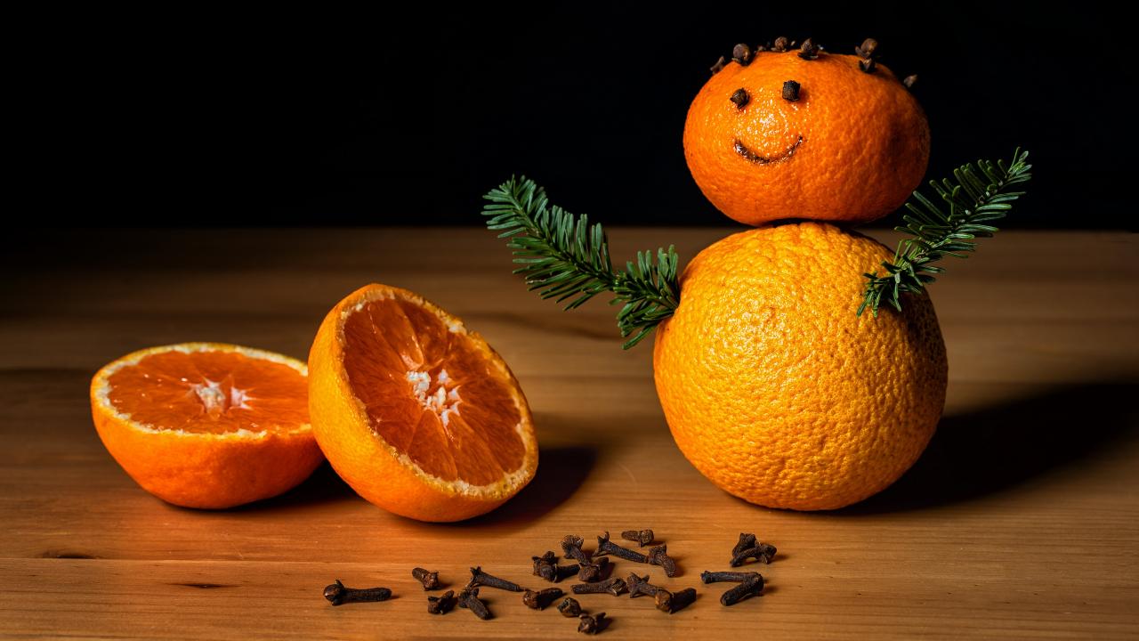Wallpaper Tangerine and cinnamon snowman on the table