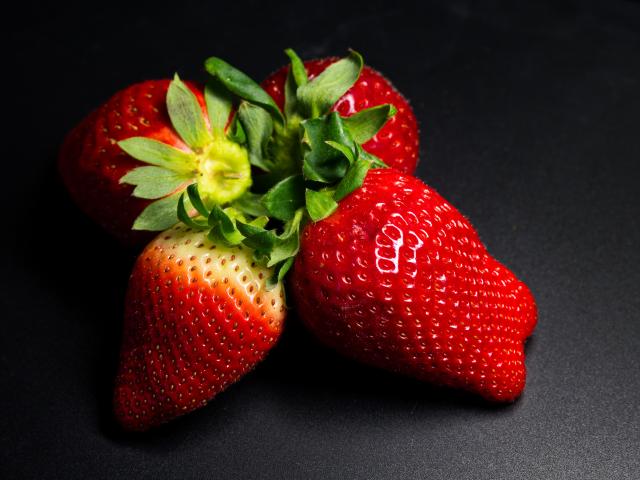 Wallpaper Four ripe red strawberries on a black table