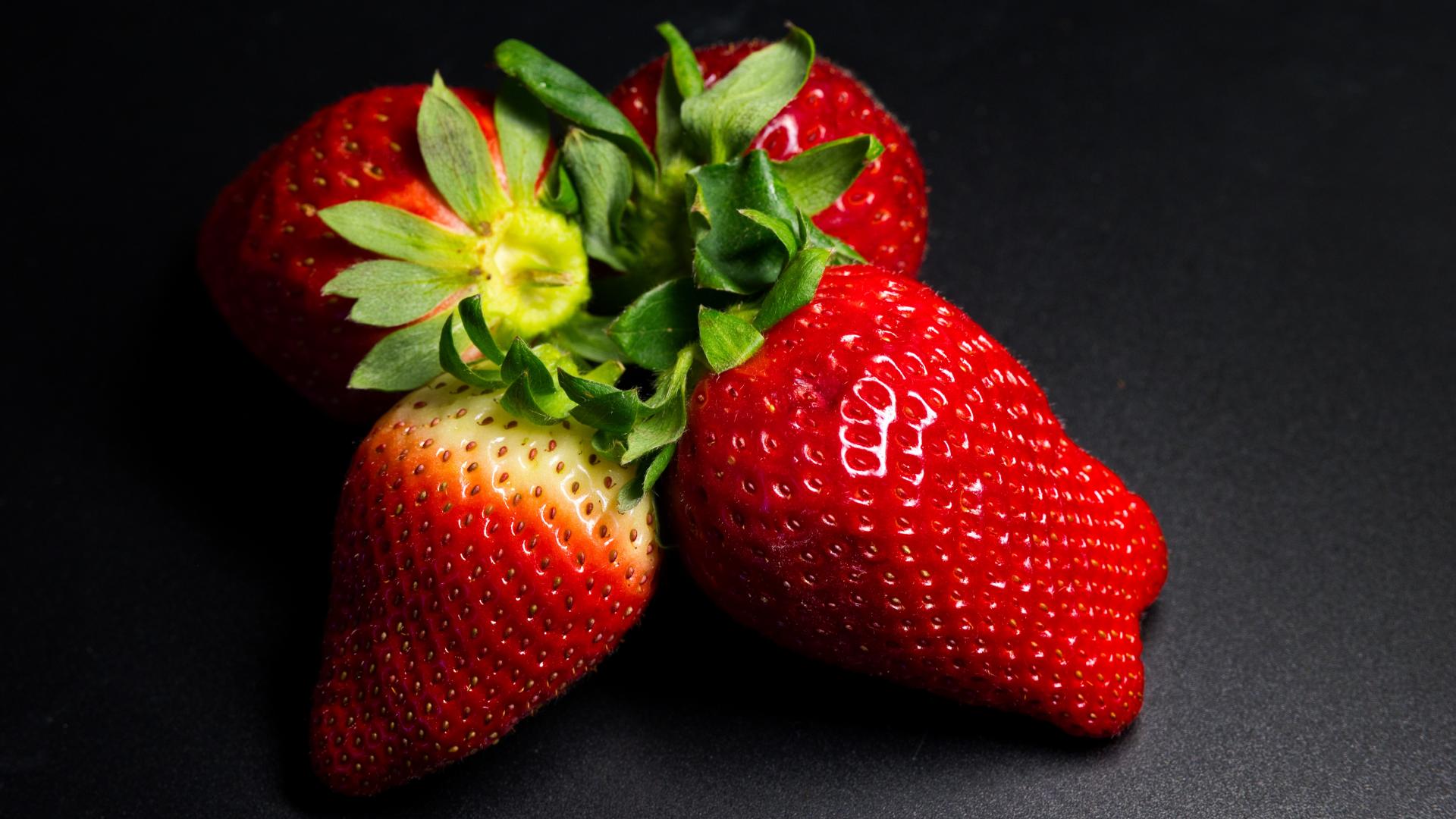 Wallpaper Four ripe red strawberries on a black table