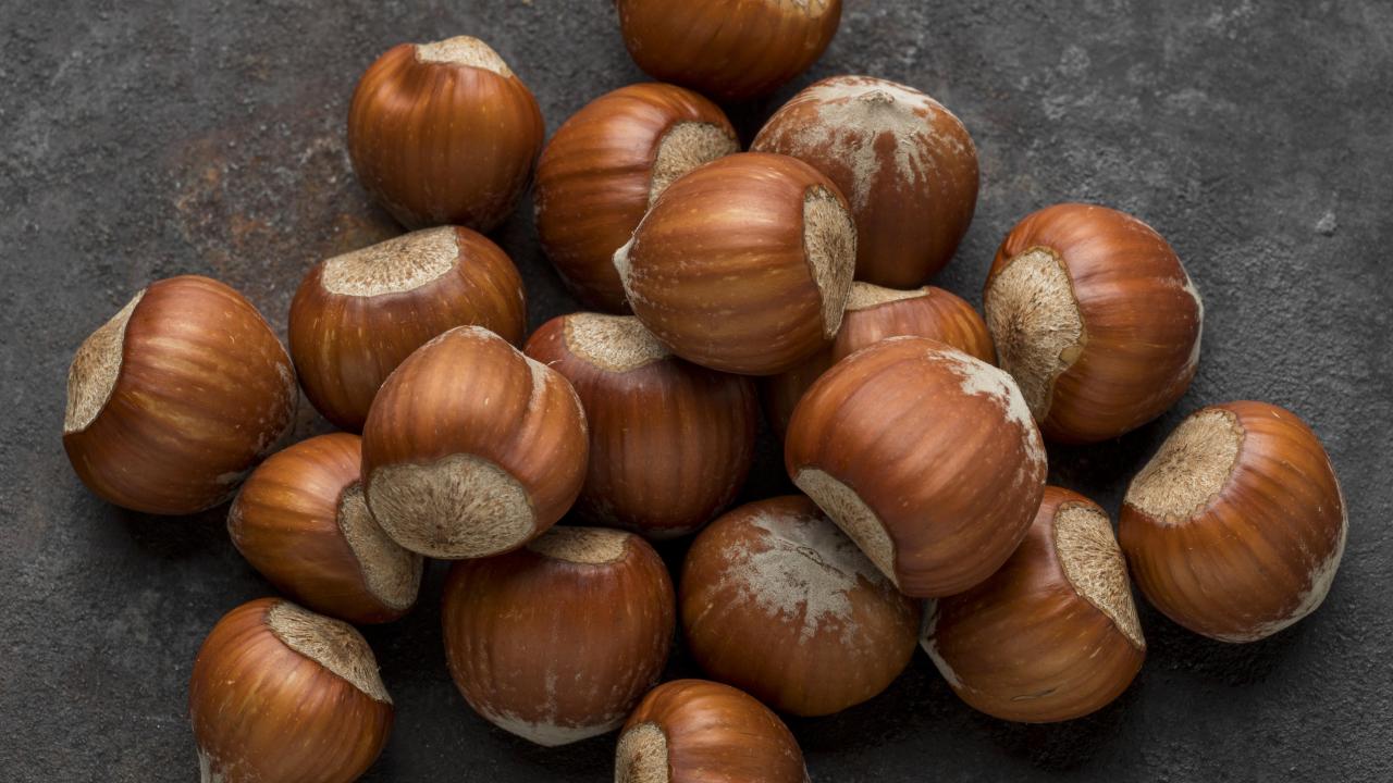 Wallpaper Heart made from hazelnuts and raspberries on a table with a red apple