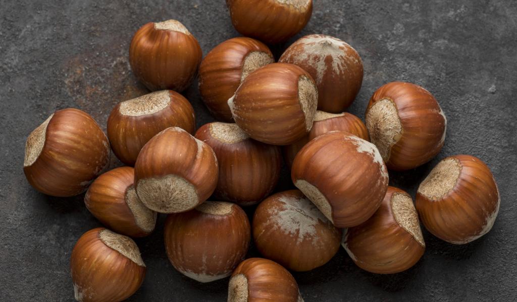 Wallpaper Heart made from hazelnuts and raspberries on a table with a red apple