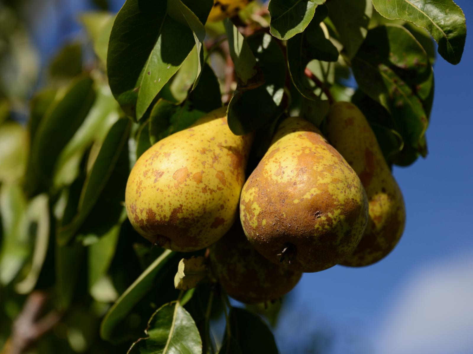 Wallpaper Ripe pears on the tree in green leaves