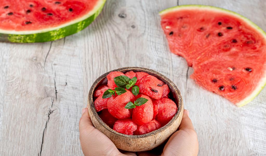 Wallpaper Watermelon pulp in a bowl in hands