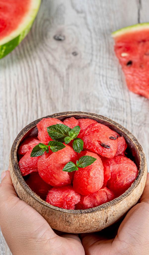 Wallpaper Watermelon pulp in a bowl in hands