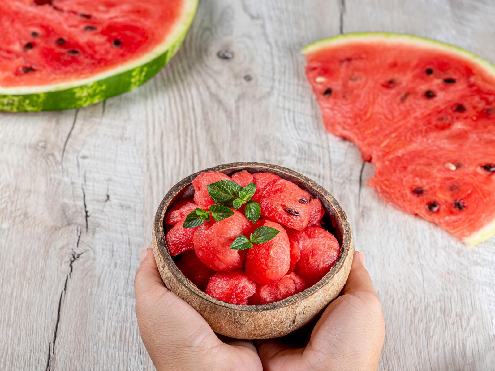 Wallpaper Sweet watermelon pulp in bowl on white background
