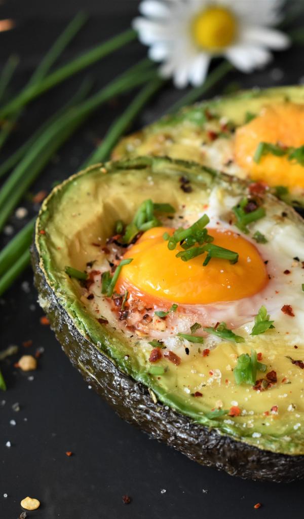 Wallpaper Baked avocado with scrambled eggs in a pan