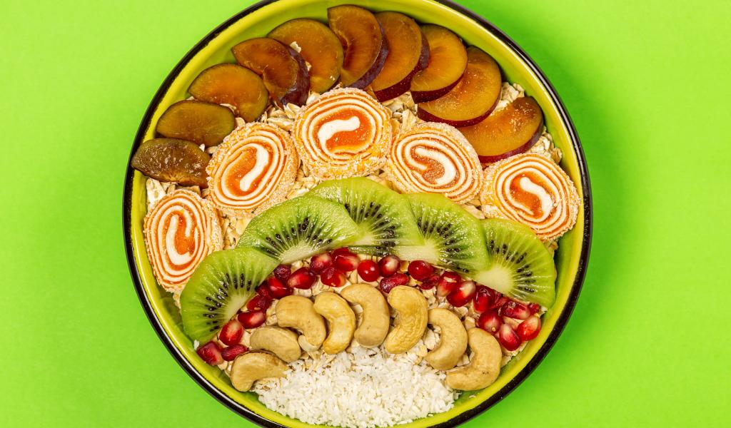 Wallpaper Muesli with yogurt in a plate with banana and peach pieces