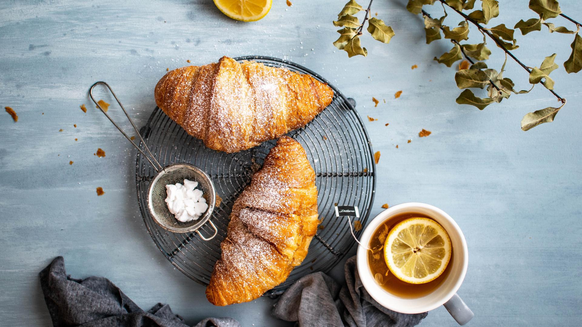 Wallpaper Two fresh croissants on a table with tea