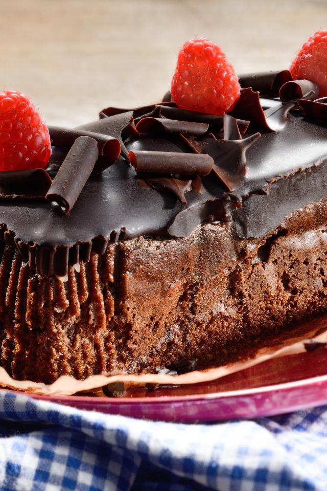 Wallpaper Chocolate cake with fresh raspberries on a plate