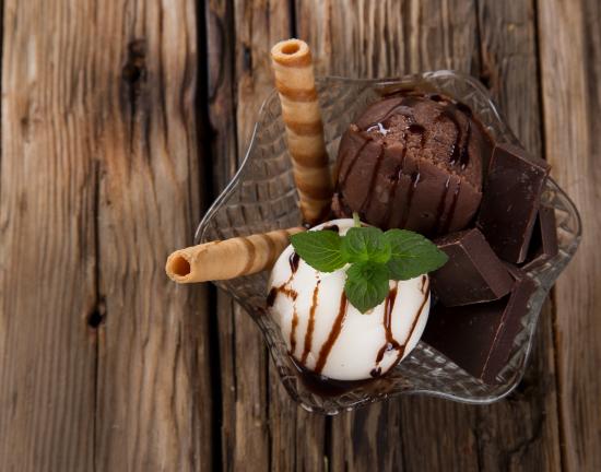 Wallpaper Ball of cream and chocolate ice cream in a bowl with straws