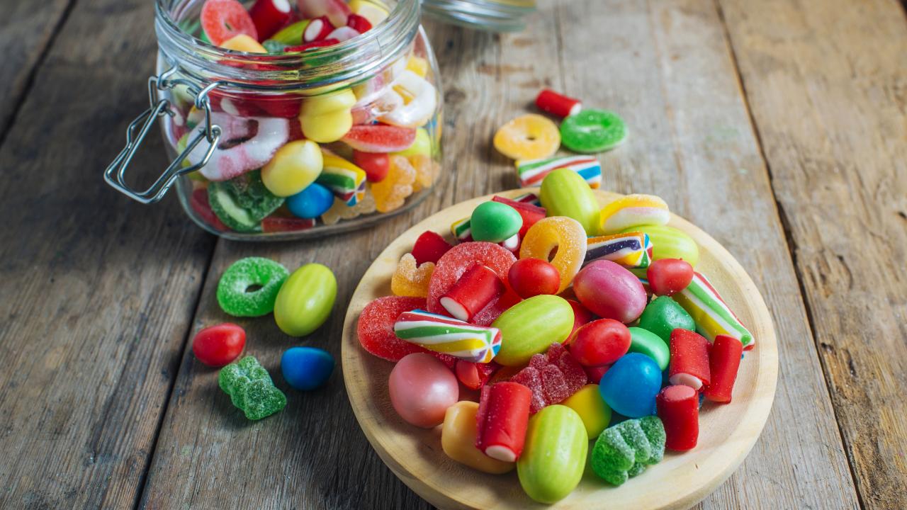Wallpaper Multicolored marmalade sweets in a glass jar on a table