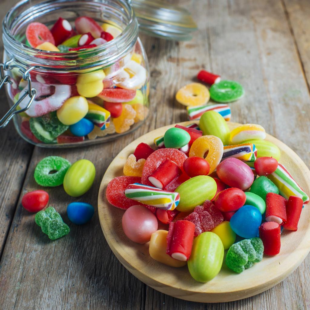 Wallpaper Multicolored marmalade sweets in a glass jar on a table