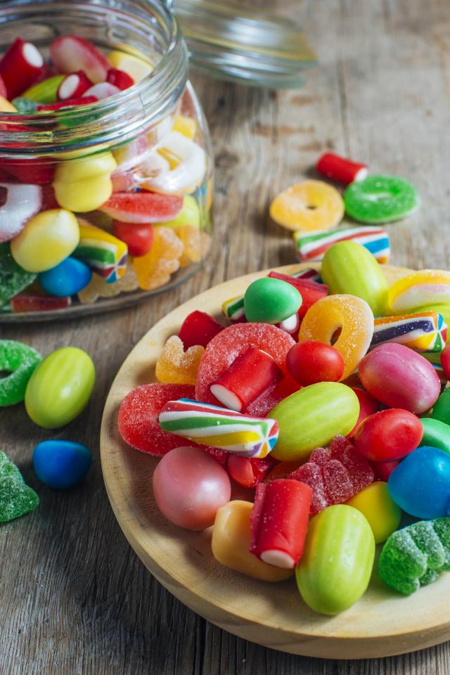 Wallpaper Multicolored marmalade sweets in a glass jar on a table