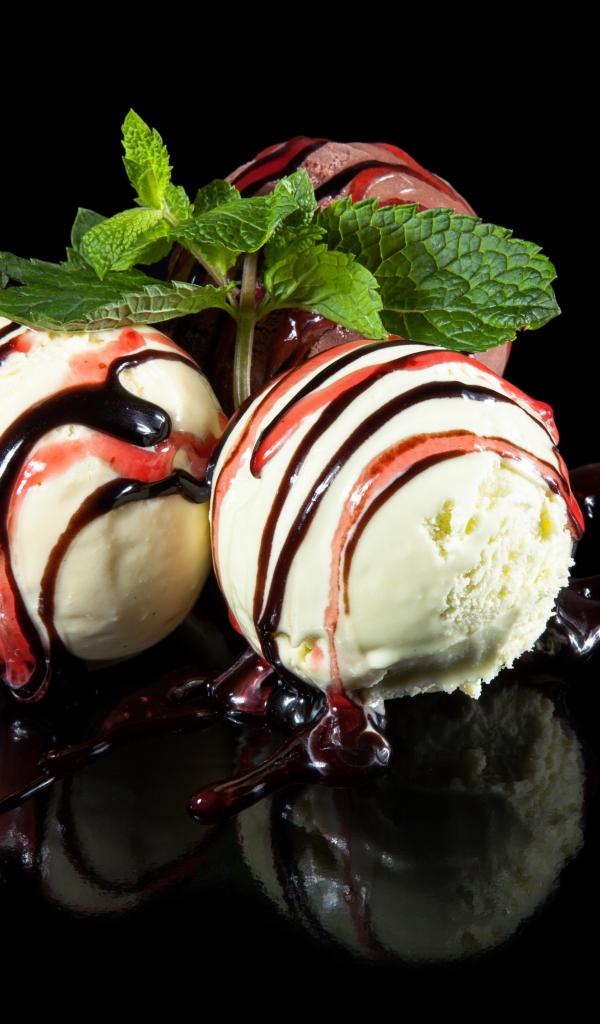 Wallpaper Three balls of ice cream with jam on a black background