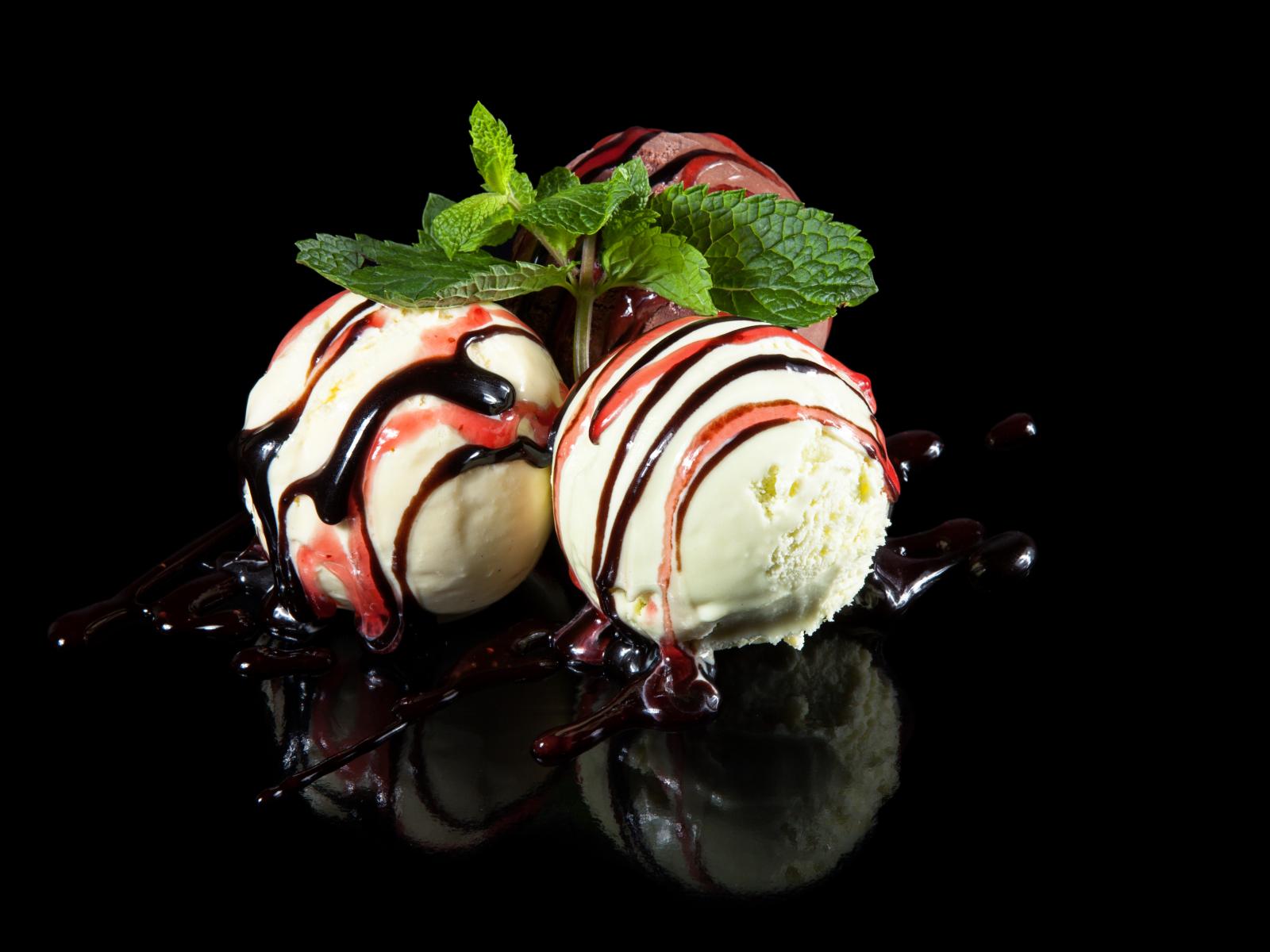 Wallpaper Three balls of ice cream with jam on a black background