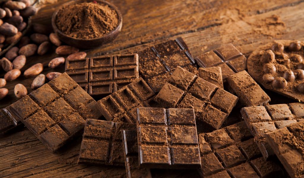 Wallpaper Tiles of dark chocolate on a table with cocoa beans