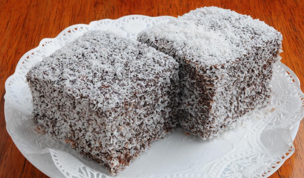 Wallpaper Two pieces of cake in coconut chips on a white plate