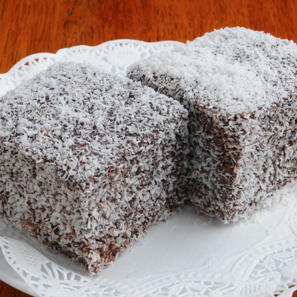 Wallpaper Two pieces of cake in coconut chips on a white plate