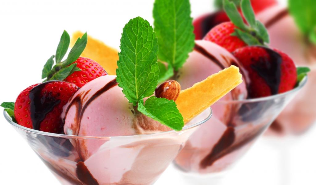 Wallpaper Ice cream balls with strawberries and mint leaves